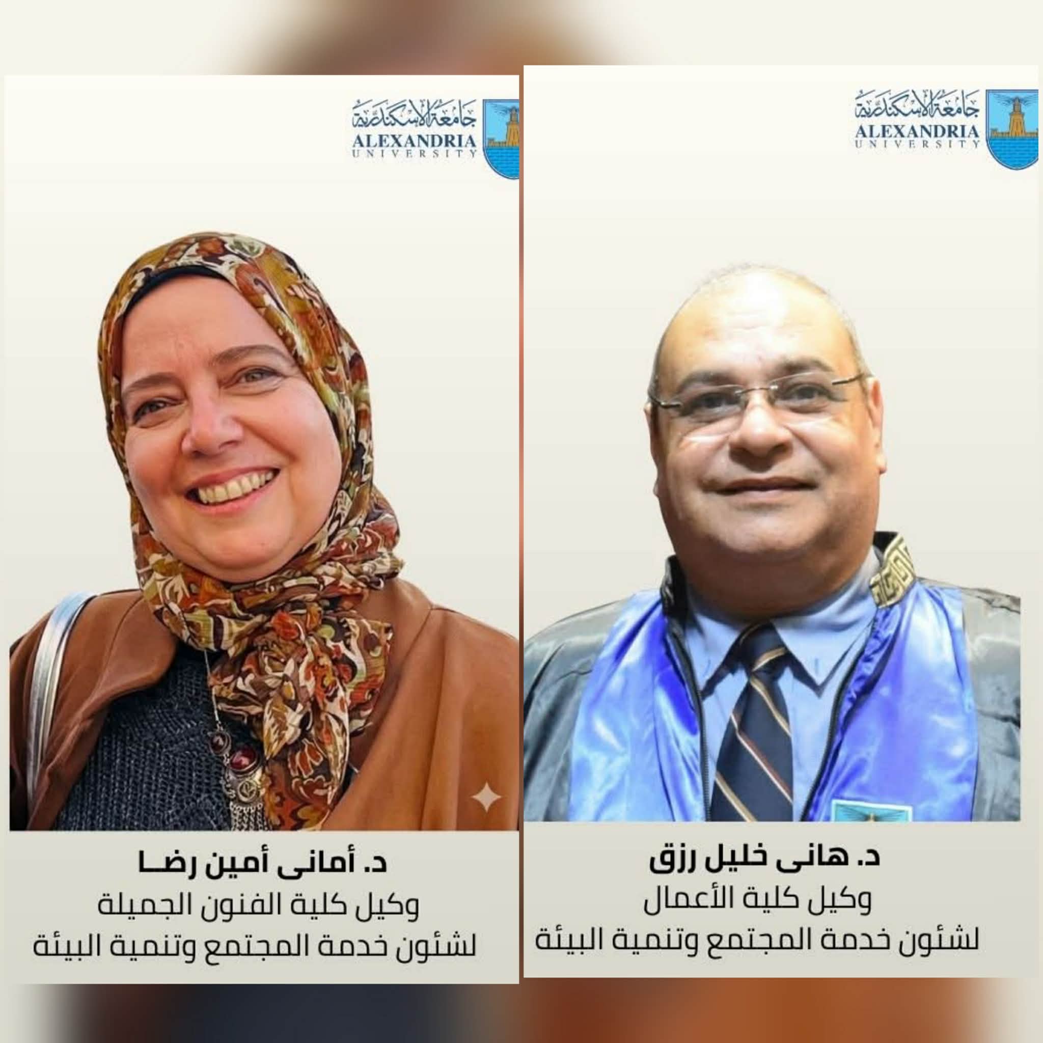 فيما تم تعيين الدكتورة أماني أمين رضا محمد، الأستاذ بقسم الديكور بكلية الفنون الجميلة، وكيلاً للكلية لشئون خدمة المجتمع وتنمية البيئة لمدة 3 سنوات، وتعيين الدكتور هاني خليل فرج رزق، الأستاذ بقسم المحاسبة بكلية الأعمال، وكيلاً للكلية لشئون خدمة المجتمع وتنمية البيئة لمدة 3 سنوات، وتعيين الدكتورة أمل كرم خليفة سمعان، الأستاذ بقسم تكنولوجيا التعليم بكلية التربية النوعية، وكيلاً للكلية لشئون خدمة المجتمع وتنمية البيئة لمدة 3 سنوات.