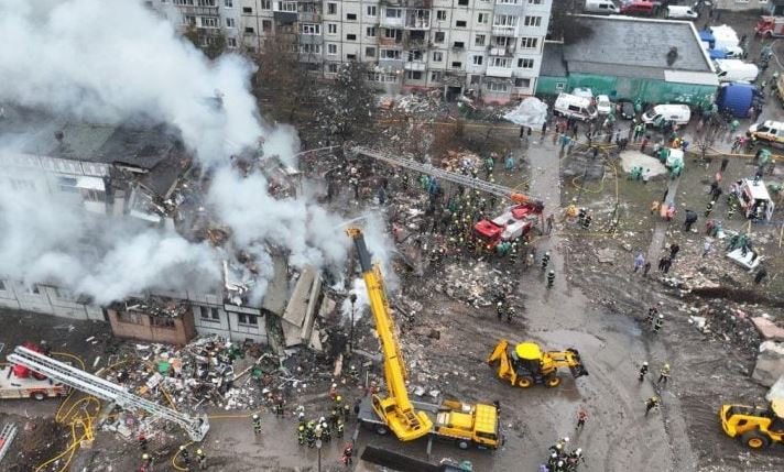 ونشرت الوزارة صورًا عبر تيليجرام تظهر المبنى السكني وقد تعرضت عدة طوابق عليا فيه لأضرار بالغة فيما تصاعدت منه أعمدة كثيفة من الدخان. كما أظهرت الصور فرق الإطفاء وعشرات من أفراد الإنقاذ وهم يبحثون بين أنقاض.