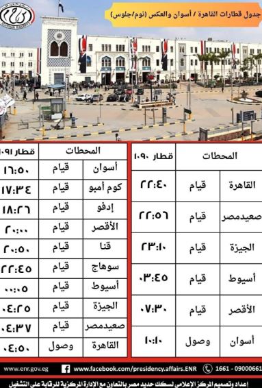 وأضافت الهيئة أنه اعتبارا من يوم الأحد 8 فبراير الجاري تقرر تشغيل قطار 1091 بعربات مختلطة (نوم / VIP PREMIUM) من أسوان إلى القاهرة على أن يعمل أيام الأحد والثلاثاء والخميس من كل أسبوع، ويقوم من محطة أسوان الساعة 16.50 مساءا يصل لمحطة القاهرة الساعة 04.50 صباح اليوم التالي طبقا للجداول المقررة.