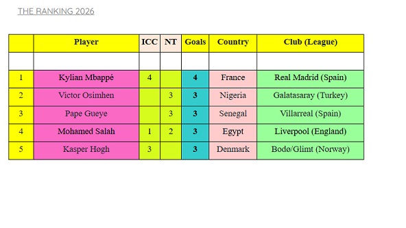 واصل النجم المصري محمد صلاح تألقه على الصعيدين الدولي والقاري، بعد أن احتل المركز الثاني في قائمة هدافي العالم لعام 2026 برصيد 3 أهداف، وفقًا لتصنيف الاتحاد الدولي للتاريخ والإحصاء، ليواصل مطاردة نجم فرنسا كيليان مبابي الذي يتصدر القائمة برصيد 4 أهداف.