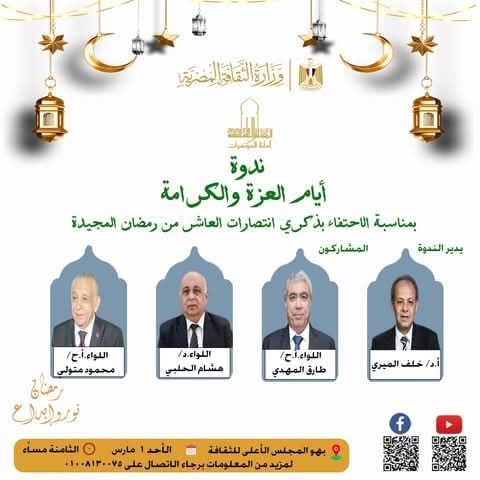 وتتناول الندوة، دلالات انتصارات العاشر من رمضان وما تمثله من معانٍ وطنية راسخة، ودورها في ترسيخ قيم العزة والكرامة في الوعي الجمعي.