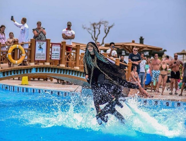 وارتدى لاعب ولاعبة "الفلاي بورد"، ملابس بدوية مجسدين شخصيات بدوية، وطارا في سماء شرم الشيخ؛ لتوزيع فوانيس رمضان على السائحين المصريين والعرب والأجانب في مشهد ساحر تفاعل مع السائحين من جميع جنسيات العالم على أنغام الأغاني الخاصة بالشهر الكريم.