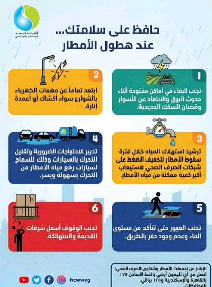 ووجهت الشركة عدة نصائح للمواطنين تزامناً مع هطول الأمطار الغزيرة لتجنب وقوع أضرار، شملت ضرورة تدبير الاحتياجات الضرورية وتقليل التحرك بالسيارات خلال تلك الفترة؛ لإفساح المجال أمام سيارات رفع مياه الأمطار للتحرك بسهولة ويسر.