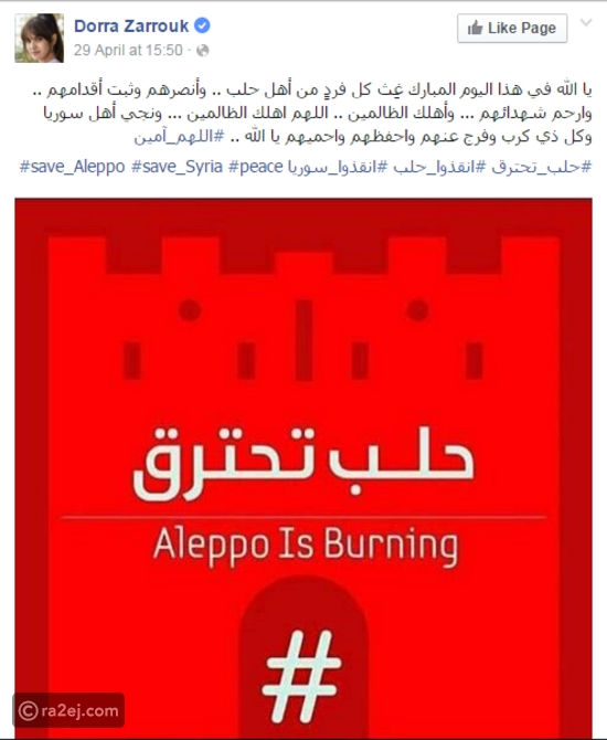 أما الفنانة المصرية زينة فكتب على صفحتها على فيسبوك: "يارب نجي أهل سوريا وحلب يارب وارفع عنهم البلاء وانقذهم ياكريم يارب قلبنا وجعنا عليهم الفرج من عندك يارب لأهلنا في سوريا من أطيب الشعوب على وش الأرض".