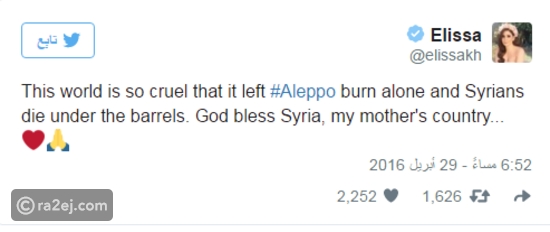 وأعادت إليسا تغريد خبر يتحدث عن قصف حلب وتضمن صورة لانتشال رضيع من تحت الأنقاض، بالإضافة إلى إعادة تغريد أبيات شعر للشاعر السوري الراحل نزار قباني يتحدث فيها عن "الحزن على الشام".
