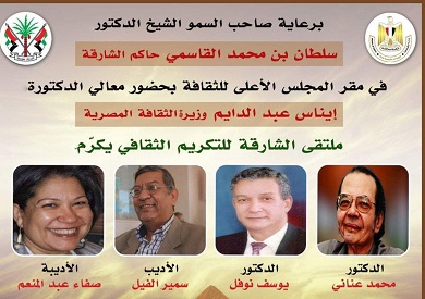 يستضيف المجلس الأعلى للثقافة، حفل التكريم الذي يقيمه ملتقى الشارقة للتكريم الثقافي، تحت رعاية الدكتور سلطان بن محمد القاسمي عضو المجلس الأعلى حاكم الشارقة، بحضور الدكتورة إيناس عبد الدايم وزيرة الثقافة المصرية، والدكتور محمد عناني، والدكتور يوسف نوفل، والأديب سمير الفيل، والأديبة صفاء عبدالمنعم.