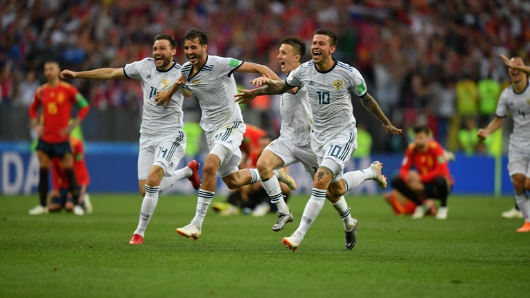 وفيما خيم الصمت على مشجعي المنتخب الإسباني خلال تسديد الفريقين ركلات الترجيح بعد انتهاء الوقت الإضافي أيضا بالتعادل ، ظلت جماهير روسيا والسامبا على التشجيع الحماسي للاعبي الدب الروسي.