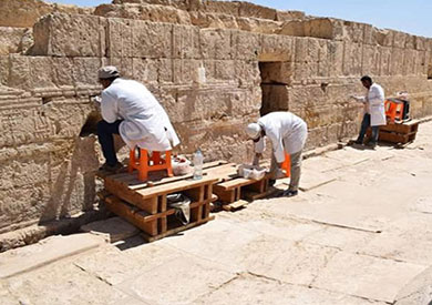 وأضاف سنبل أن أعمال الترميم بدأت في موسم أعمال البعثة في أكتوبر 2018، بتوثيق وتسجيل كافة مظاهر التلف الموجودة على العناصر المعمارية للمعبد ـ ودراسة مسبباتهاـ ووضع خطة ترميم كاملة، والتي شملت الترميم الميكانيكي، وتثبيت وتدعيم طبقات الملاط المنفصلة، وتثبيت القشور اللونية، وعلاج الشروخ الموجودة بالمونة الجيرية، كما تم عمل مظلات واقية لحماية المعبد من تأثير أشعة الشمس والأتربة ومياه الأمطار.