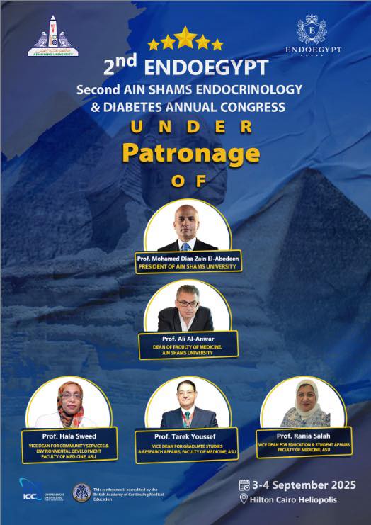 تنظم كلية الطب بجامعة عين شمس فعاليات مؤتمر الغدد الصماء والسكر في نسخته الثانية، وذلك تحت رعاية الدكتور محمد ضياء زين العابدين رئيس جامعة عين شمس، الدكتور علي الأنور عميد كلية الطب ورئيس مجلس إدارة المستشفيات الجامعية.
