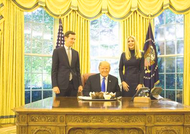 وأظهرت الصورة إيفانكا وزوجها يقفان بجانب مكتب «ترامب» في البيت الأبيض، بينما كان يجلس «ترامب» على المكتب، وأمامه حلوى عيد الميلاد.
