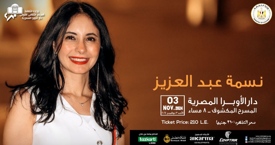 يقام مساء الأحد المقبل، حفلا موسيقيا لعازفة الماريمبا الفنانة نسمة عبد العزيز، على المسرح المكشوف، تنظمه دار الأوبرا المصرية برئاسة الدكتورة لمياء زايد.