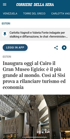 سلطت وسائل الإعلام الإيطالية، الضوء على فعاليات افتتاح المتحف المصري الكبير، المقرر مساء اليوم السبت الأول من نوفمبر، ووصفت تصميمه بأنه «عصري مذهل»، فيما أشارت وسائل أخرى إلى دوره المرتقب في تعزيز السياحة والاقتصاد المصري، معتبرة إياه استثمارا استراتيجيا حقيقيا للاقتصاد الوطني.