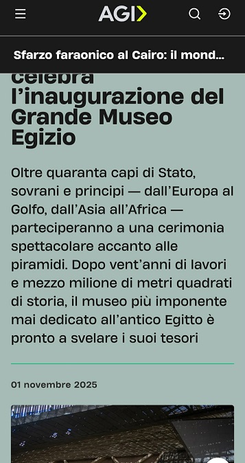 وتحت عنوان: «احتفالات فرعونية في القاهرة: العالم يحتفل بافتتاح المتحف المصري الكبير»، قالت وكالة الأنباء الإيطالية آجي، إن العالم يحتفل بهذا الافتتاح بمشاركة أكثر من 40 رئيس دولة وملكا وأميرة من أوروبا إلى الخليج، ومن آسيا إلى إفريقيا، في حفل مبهر بجوار الأهرامات.