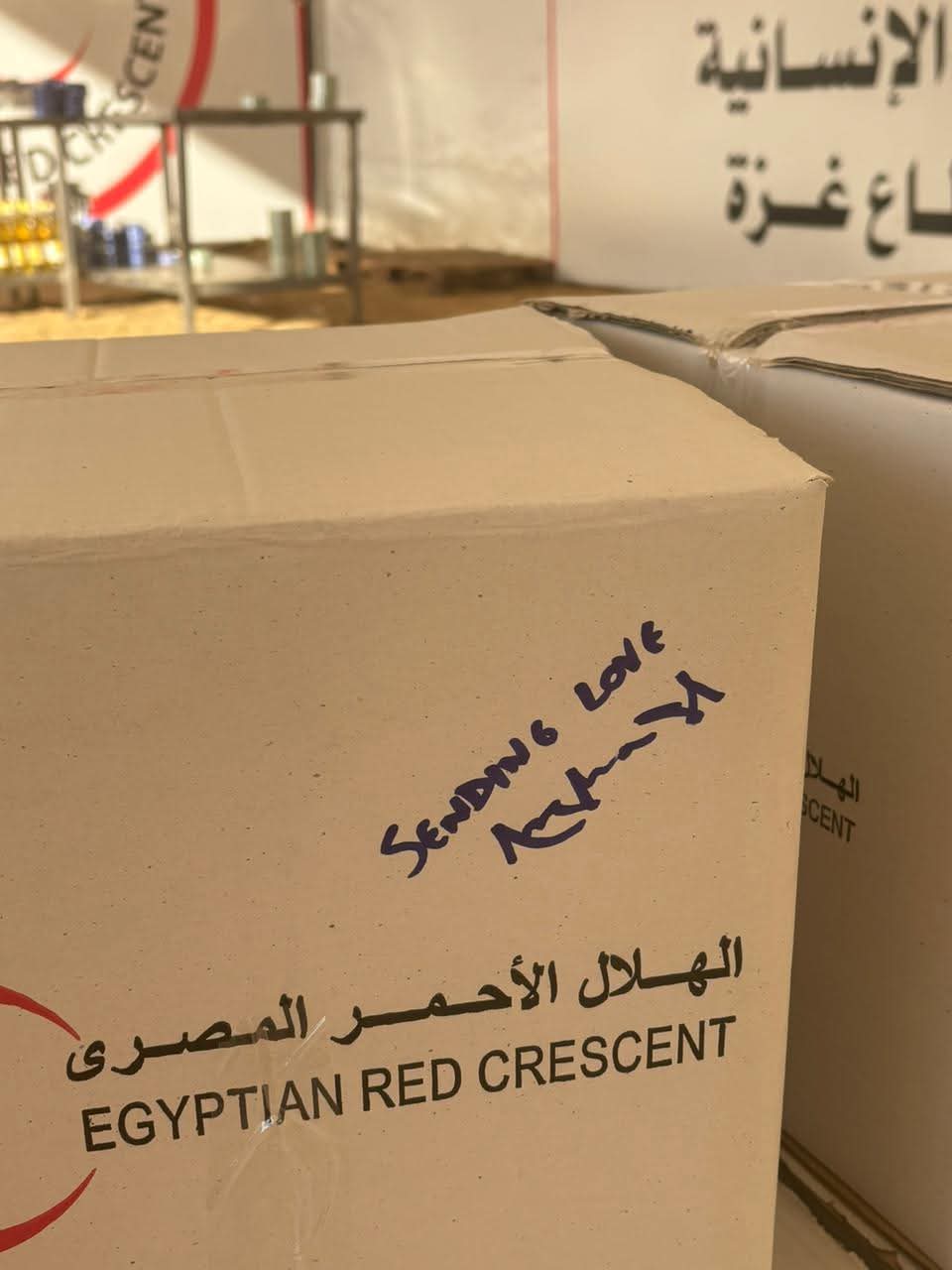 وخلال الزيارة، شاركت أنجلينا جولي في تعبئة أحد صناديق المساعدات الإنسانية المخصصة لقطاع غزة، في تأكيد رمزى على التضامن الإنساني والدعم الدولي للجهود المبذولة وكتبت جملة "أرسل محبتي" ممهورة بتوقيعها.