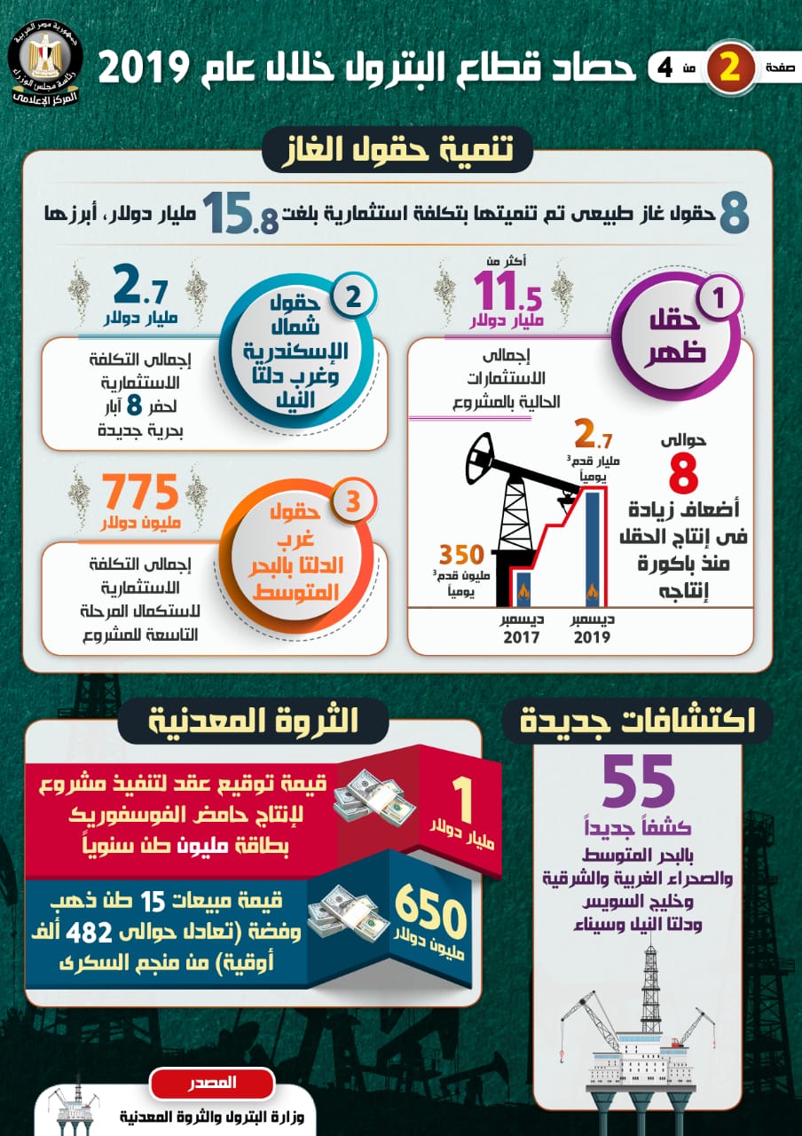 واستعرض الإنفوجراف، عدداً من حقول الغاز الطبيعي التي تم تنميتها خلال عام 2019، مشيراً إلى أن التكلفة الاستثمارية لتنمية 8 حقول غاز طبيعي، بلغت نحو 15.8 مليار دولار، أبرزها تنمية حقل ظهر، ليتضاعف إنتاجه 8 أضعاف منذ باكورة إنتاجه في ديسمبر 2017، ليصل معدل الإنتاج بالحقل إلى 2.7 مليار قدم3/يوم، في ديسمبر 2019، مقارنة بـ 350 مليون قدم3/يوم في ديسمبر 2017، بإجمالي قيمة استثمارية أكثر من 11.5 مليار دولار، هذا بالإضافة إلى تنمية حقول شمال الإسكندرية، وغرب دلتا النيل بإجمالي تكلفة استثمارية 2.7 مليار دولار، وذلك لحفر 8 آبار بحرية جديدة.