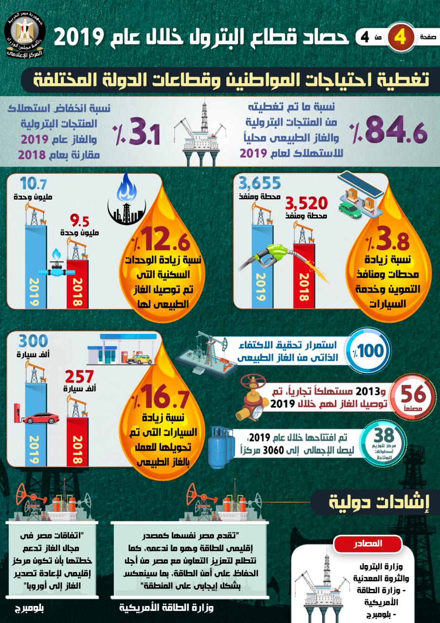 ووفقاً للإنفوجراف، فقد زادت محطات ومنافذ التموين وخدمة السيارات بنسبة 3.8%، لتصل إلى 3655 محطة ومنفذ عام 2019، مقارنة بـ 3520 محطة ومنفذ عام 2018، هذا إلى جانب توصيل الغاز الطبيعي للوحدات السكنية والتي زادت بنسبة 12.6%، لتصل إلى 10.7 مليون وحدة عام 2019، مقارنة بـ 9.5 مليون وحدة عام 2018، كما أن هناك استمرار في تحقيق الاكتفاء الذاتي من الغاز الطبيعي بنسبة 100%، وكذلك توصيل الغاز لـ 2013 مستهلكاً تجارياً، و56 مصنعاً خلال عام 2019، فضلاًَ عن افتتاح 38 مركزاً لتوزيع اسطوانات البوتوجاز خلال عام 2019، ليصل الإجمالي 3060 مركزاً، في حين زاد عدد السيارات التي تم تحويلها للعمل بالغاز الطبيعي بنسبة 16.7%، لتصل إلى 300 ألف سيارة عام 2019، مقارنةبـ 257 ألف سيارة عام 2018.