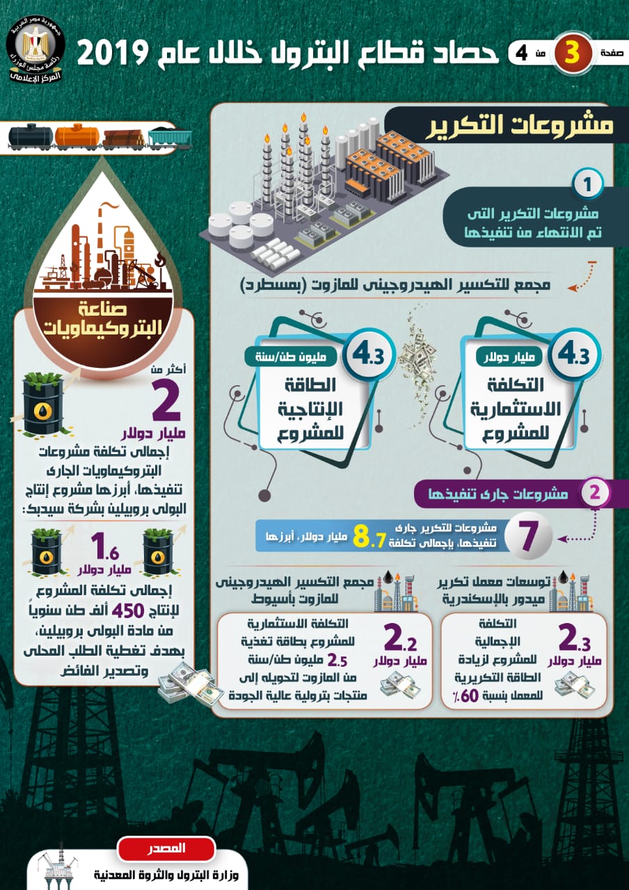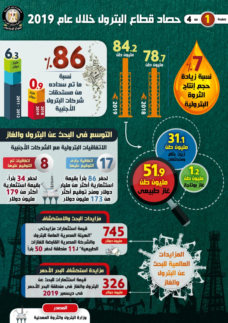نشر المركز الإعلامي لمجلس الوزراء، إنفوجرافاً سلط من خلاله الضوء على إنجازات قطاع البترول خلال عام 2019.