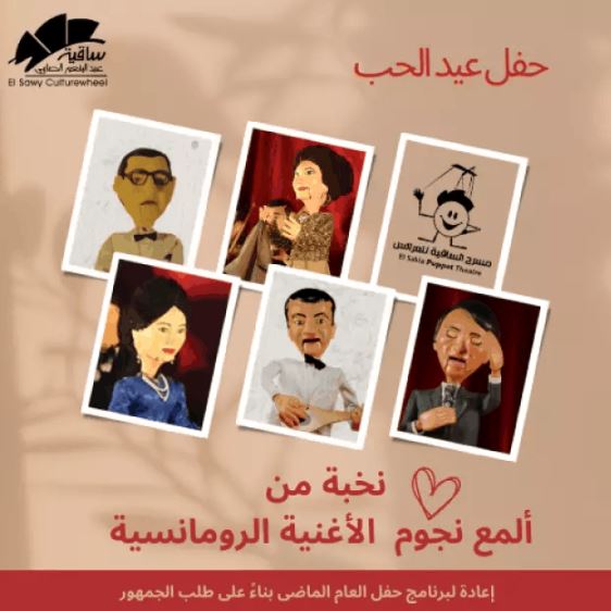 يحتفل فريق مسرح الساقية للعرائس مع جمهوره بعيد الحب، حيث يقدم حفلًا بعرائس الماريونيت لنجوم الأغنية الرومانسية ومنهم كوكب الشرق أم كلثوم والعندليب الأسمر عبد الحليم حافظ وموسيقار الآجيال محمد عبد الوهاب ومعبودة الجماهير شادية وملك العود، وذلك في السابعة والنصف مساء 13 فبراير الجاري على مسرح الحكمة بساقية الصاوي بالزمالك.