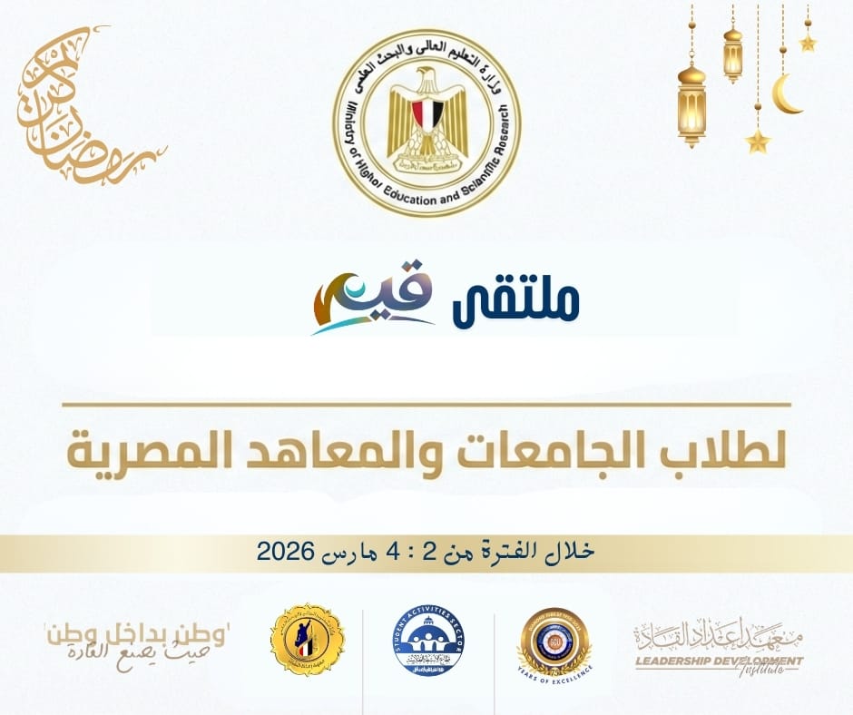 تنطلق مساء اليوم الاثنين 2 مارس 2026، فعاليات ملتقى "قيم" لطلاب الجامعات والمعاهد المصرية، ويأتي ذلك تنفيذًا لتوجهات الدولة المصرية نحو بناء الإنسان وتعزيز منظومة القيم لدى الشباب الجامعي.