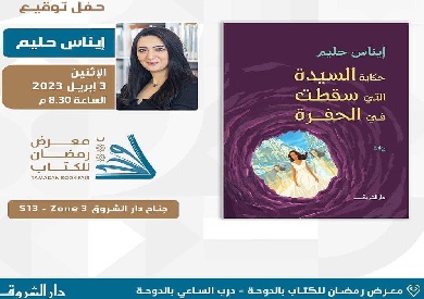 يشهد جناح دار الشروق بمعرض رمضان للكتاب بالدوحة، حفل توقيع رواية "حكاية السيدة التي سقطت في الحفرة"، للكاتبة إيناس حليم، وذلك مساء يوم الإثنين المقبل.