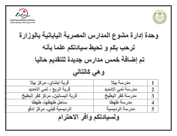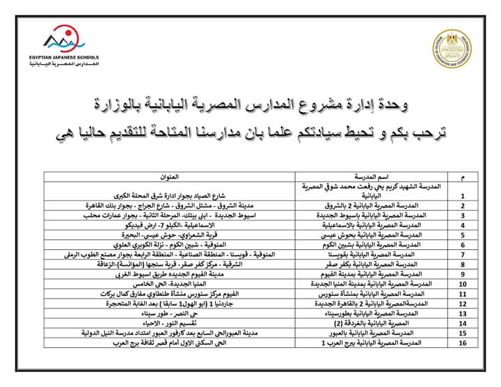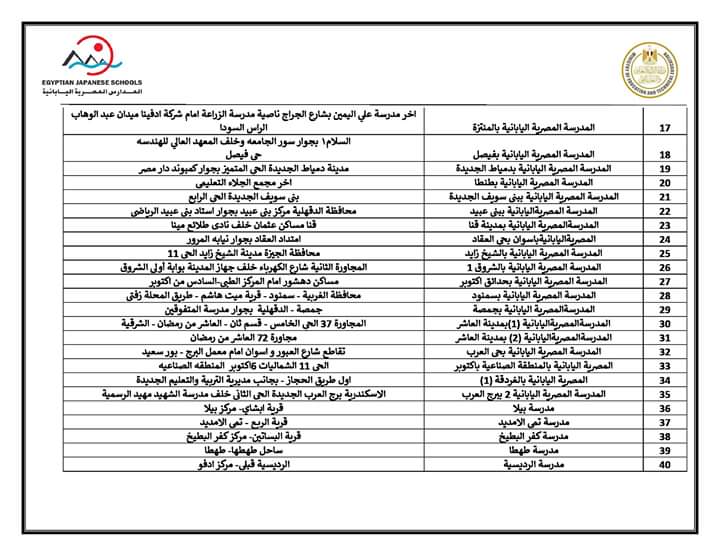 وأعلنت وزارة التربية والتعليم عن دخول 5 مدارس جديدة الخدمة مع بداية العام الدراسي المقبل، ليبلغ عدد المدارس اليابانية 40 مدرسة علي مستوي الجمهورية.
