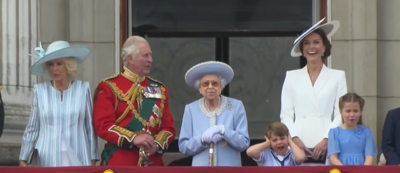 ووقفت ملكة بريطانيا في شرفة قصر باكينجهام، اليوم الخميس، وإلى جوارها ابنها الأمير تشارلز، ولي العهد البريطاني، وزوجته كاميلا دوقة كورونوال، إضافة إلى كيت ميدلتون دوقة كامبريدج، وأطفالها الأمير جورج والأميرة شارلوت والأمير لويس.