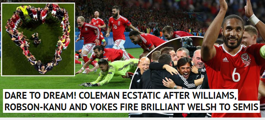"تجرأ على الحلم" هكذا قالت صحيفة "ميرور" عن الفوز التاريخي لويلز على بلجيكا بثلاثة أهداف لهدف ، حيث أكدت أن نجوم ويلز من حقهم أن يأملوا حتى في الفوز باللقب بعد وصولهم لهذه المرحلة من البطولة .
