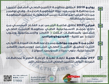 وتابع «الانفوجراف» : في فبراير 2021 أطلق فخامة الرئيس عبد الفتاح السيسي من داخل مجمع الاسماعيلية الطبي منظومة التأمين الصحي الشامل بالمحافظات الثلاث «الأقصر والإسماعيلية وجنوب سيناء» عبر تقنية {الفيديوكونفرانس}، لتقدم المحافظات الأربع حتى الآن 24.5 مليون خدمة طبية وعلاجية من خلال منشآتها الصحية التي تغطي كافة أرجاء الأربع محافظات.