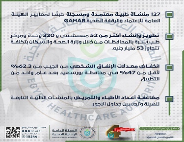 واختتم «الانفوجراف» بإطلاق هيئة الرعاية الصحية مشروعها للسياحة العلاجية تحت شعار العلامة التجارية (نرعاك في مصر)، وذلك لاستقطاب الوافدين الأجانب وعلاجهم بمستشفيات الهيئة بالمحافظات، لتحقيق استراتيجية الهيئة الرامية لوضع مصر بمقدمة خريطة السياحة العلاجية العالمية، وبما يتسق مع الأهداف الاستراتيجية للهيئة ورؤية مصر 2030.