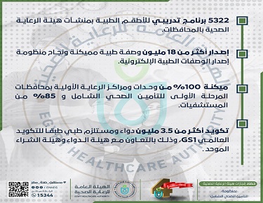بينما تم تكويد أكثر من 3.5 مليون دواء ومستلزم طبي طبقاً للتكويد العالمي GS1، وذلك بالتعاون مع هيئة الدواء المصرية وهيئة الشراء الموحد، وإصدار أكثر من 18 مليون وصفة طبية مميكنة ونجاح منظومة إصدار الوصفات الطبية الإلكترونية، فيما تم مضاعفة أعداد الأطباء والتمريض بالمنشآت الطبية التابعة للهيئة وتحسين جداول الأجور، وتقديم 5322 برنامج تدريبي للأطقم الطبية بمنشآت هيئة الرعاية الصحية بالمحافظات.