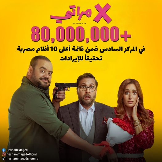 حقق فيلم "إكس مراتي" أمس، 215 ألف جنيه، ليحتل المركز الثاني بين الأفلام المتنافسة على شباك التذاكر، ويصل إجمالي إيراداته بعد 10 أسابيع عرض إلى 85 مليونًا و326 ألف جنيه.