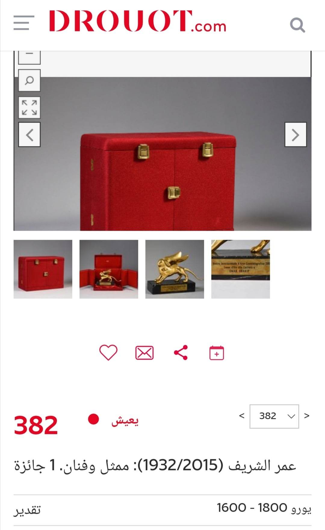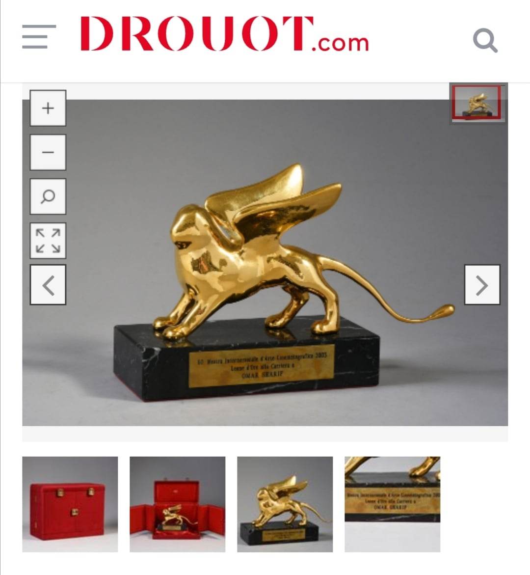 يعرض المزاد جائزة "أسد البندقية" الذهبية للبيع أيضا، التي حصل عليها الشريف عن أدواره العديدة في السينما، وهي مذهبة ومن البرونز والرخام، في صندوقها الأصلي، وسيبدأ سعرها من 1600 - 1800 يورو.