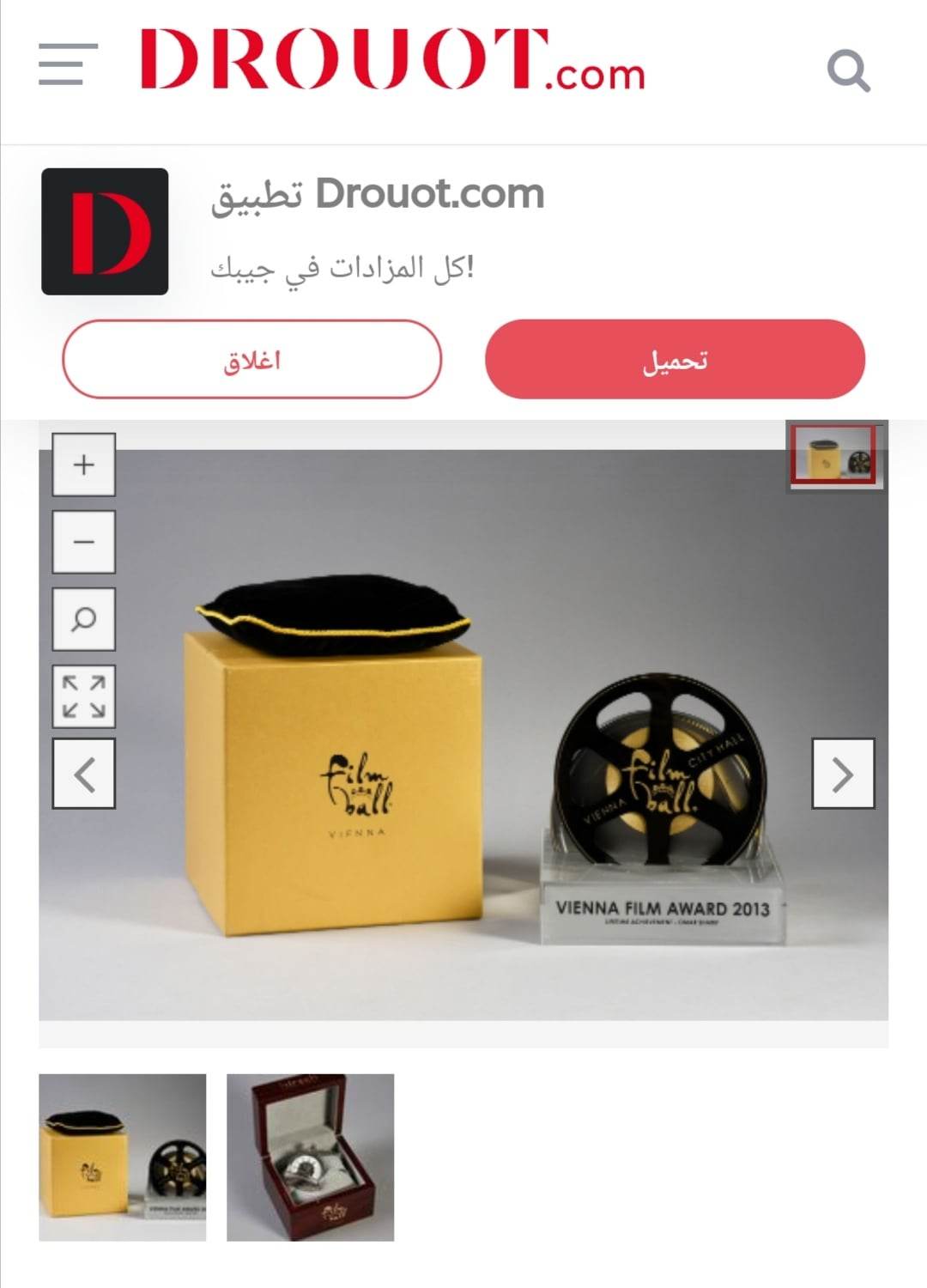 كما عرض الموقع بيع "جائزة فيينا فيلم" التي منحت لعمر الشريف عام 2013، عن أدواره العديدة في السينما، بحجم 20.5x20.5، وارتفاع 20 سم، في صندوقها الأصلي.