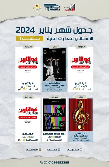 وفي السابعة مساء السبت المقبل تقدم فرقة "ليالي غصن الزيتون" حفلًا غنائيًّا، وفي السابعة مساء 14 يناير حفل غنائي لآخر الليل باند.