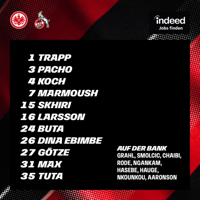 أعلن أوليفر جلاسنر، المدير الفني لـ آينتراخت فرانكفورت، تشكيل فريقه لمباراة كولن، اليوم الأحد، على ملعب دوتش يانك بارك، ضمن منافسات الجولة الثالثة من الدوري الألماني.