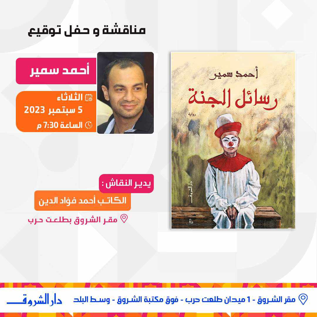 تنظم دار الشروق حفل توقيع ومناقشة رواية "رسائل الجنة" للكاتب أحمد سمير، في مقر الشروق بميدان طلعت حرب، يوم الثلاثاء الموافق 5 سبتمبر 2023، في تمام الساعة السابعة ونصف مساء.
