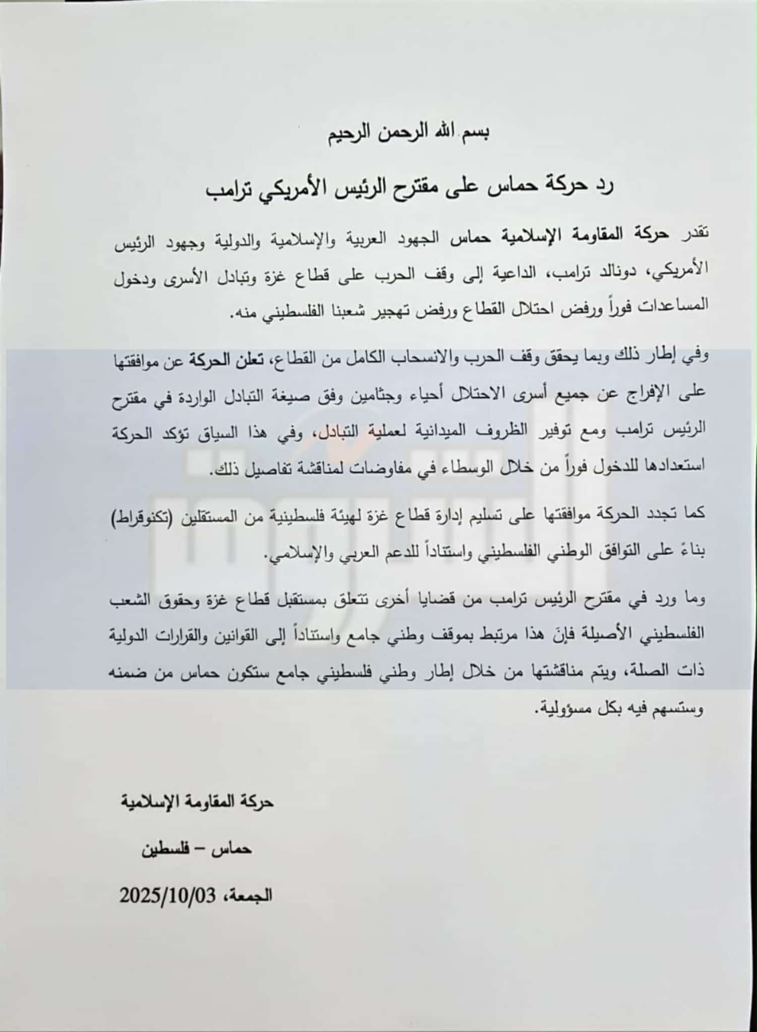 ننشر الرد الرسمي من حركة حماس على خطة ترامب لإنهاء حرب غزة - موافقة مشروطة على الخطة