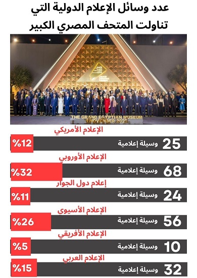 وبحسب الهيئة العامة للاستعلامات، بلغ عدد وسائل الإعلام الدولية الكبري ذات الأهمية والانتشار التي تناولت افتتاح المتحف المصري الكبير حوالي ۲۱٥ وسيلة إعلامية، منها: ۲۵ وسائل إعلام أمريكية، بنسبة 12%، و68 وسيلة إعلامية أوروبية، بنسبة 32%، و24 وسيلة إعلامية من دول الجوار، بنسبة 11%، و56 وسيلة إعلامية أسيوية، بنسبة26%، 10 وسائل من الإعلام الأفريقي، بنسبة 5%، و32 وسيلة إعلامية من العالم العربي بنسبة 15%، مع ملاحظة عدم تكرار الوسائل التي تناولت أكثر من مادة في تغطياتها.