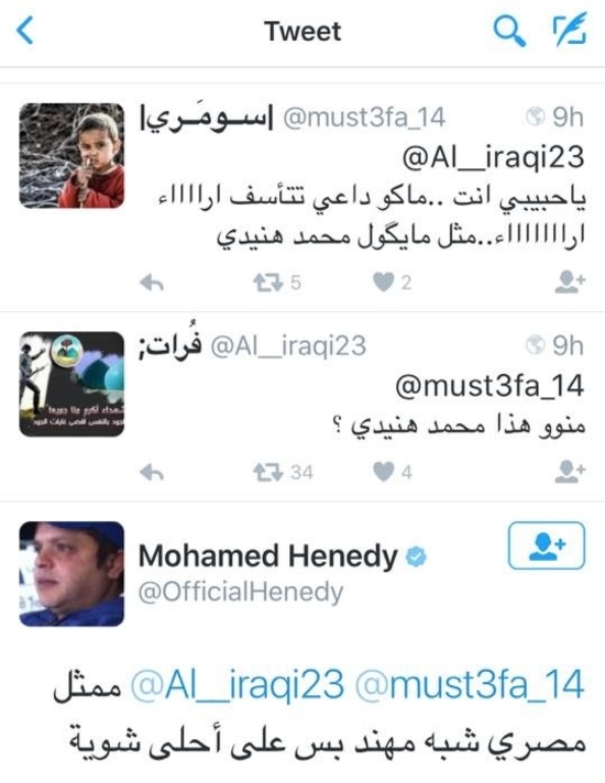 فخلال محادثة على تويتر بين شخصين، قال أحدهما للآخر "يا حبيبي أنت ما كو داعي تتأسف أراااء أراااء مثل ما يقول محمد هنيدي"، حيث استشهد بكلمات هنيدي في فيلم "رمضان مبروك أبو العلمين حمودة.