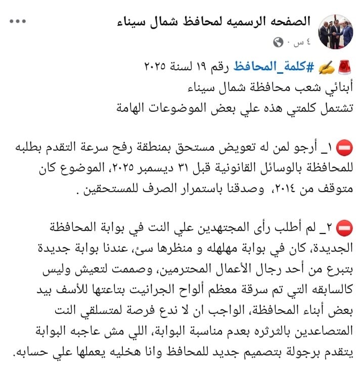 ونشر المحافظ عبر صفحته الرسمية قائلاً: "لم أطلب رأي المجتهدين على النت في بوابة المحافظة الجديدة، كان هناك بوابة مهلهلة ومنظرها سيئ. لدينا الآن بوابة جديدة بتبرع من أحد رجال الأعمال المحترمين، وصممت لتستمر طويلاً، وليس كالسابق التي تم سرقة معظم ألواح الجرانيت الخاصة بها، للأسف، على يد بعض أبناء المحافظة".
