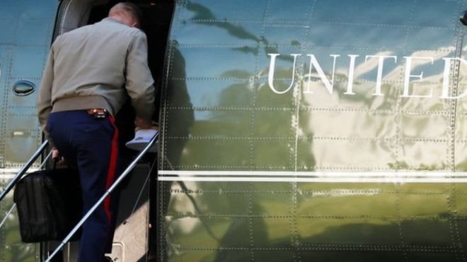 يوم 20 يناير/ كانون الثاني من العام الماضي، تقدم عسكري يحمل حقيبة جلدية من دونالد ترامب في حفل تنصيبه وهو يقف قرب الرئيس أوباما. وبعدما أدى ترامب اليمين الدستورية انتقل العسكري إلى جانب ترامب.