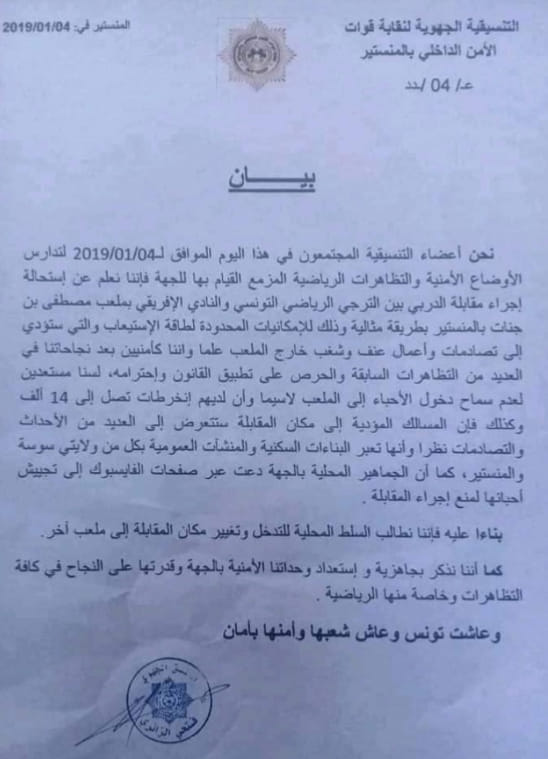 شهد الاجتماع الأمني للمباراة المرتقبة بين الترجي والإفريقي التونسيان أزمة بعد نهايته بسبب اعتراض الجهات الأمنية لمدينة المنستير التونسية على إقامة الديربي في ملعب مصطفى بن جنات، للقاء المؤجل من الاسبوع الـ11 من الدوري التونسي، والمقرر إقامته غدا السبت.