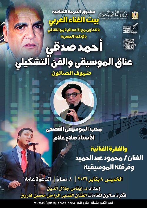 يقيم بيت الغناء العربي، أولى حلقات صالون "مقامات" للموسيقى والغناء لعام 2026 في الثامنة مساء الخميس المقبل بمقره في قصر الأمير بشتاك الأثري في شارع المعز لدين الله الفاطمي.