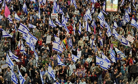 تظاهر حوالي 160 ألف شخص في تل أبيب ضد الإصلاحات القضائية المزمعة للحكومة الإسرائيلية، اليوم السبت، كما توافد أشخاص للاحتجاج في حيفا ونتانيا.