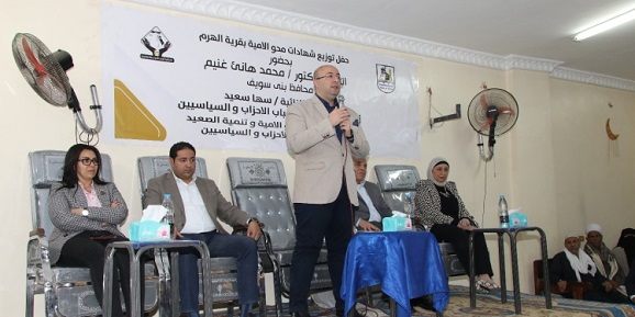 شهد الدكتور محمد هاني غنيم محافظ بني سويف، احتفالية توزيع شهادات محو الأمية بقرية الهرم بمركز الواسطي، التي نظمتها المحافظة ضمن نتائج المبادرة التي يتم تنفيذها وفقا لبرتوكول موقع بين تنسيقية شباب الأحزاب والسياسيين وهيئة تنمية الصعيد، ويشترك في تنفيذها مع عدد من الجهات التنفيذية والمجتمعية من المديريات والقطاعات، والجهات الحكومية والمجالس القومية ومؤسسات المجتمع المدني من الجمعيات الأهلية، وتستهدف تنمية وتطوير القرية وتحويلها إلى قرية منتجة توفر فرص عمل وتحقيق تمكين اقتصادي لمواطنيها، وتعديل سلوكهم إلى العمل الحر واستغلال الميزة التنافسية بقربها من هرم ميدوم، وتحويلها إلى "قرية تراثية وحرفية وسياحية".