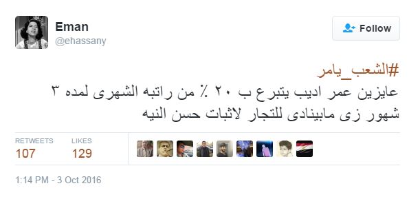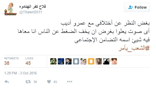 فى حين قال مستخدم يدعى «فلاح كفر الهنادوة»: «بغض النظر عن اختلافى مع عمرو أديب، أى صوت يخفف الضغط عن الناس أنا معاها، في شيء اسمه التضامن الإجتماعى». وفي ثالث حلقات البرنامج، لم يسلم عمرو أديب من الجمهوري، حيث طالبته المستخدمة «إيمان» بالتبرع بـ20% من راتبه الشهري لمدة ثلاثة أشهر، مثلما يطالب التجار.