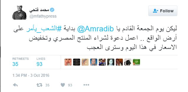 أطلق الإعلامى عمرو أديب منذ قليل عبر برنامجه "كل يوم" على فضائية On E، حملة بعنوان "الشعب يأمر"، تهدف إلى تخفيض أسعار السلع 20% لمدة ثلاثة أشهر؛ تخفيفًا للأعباء التى يتحملها كاهل المواطن. وربط "أديب" هذه الحملة بالتزامن مع ماتردد من أنباء بشأن "تعويم الجنيه"، وتصدر هاشتاج «#الشعب_يأمر» موقع التواصل الاجتماعي "تويتر" بعد دقائق من تدشينه. وفيما يلي ترصد «الشروق» جانبًا من تغريدات المستخدمين..