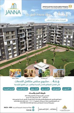 وأعلنت الوزارة، هذا الأسبوع، طرح أكثر من 7 آلاف وحدة بمشروع جنة، للإسكان الفاخر، بمساحات تتراوح بين 115 و150 م2، في 6 مدن جديدة، هي: الشيخ زايد، و6 أكتوبر، والعبور، والشروق، ودمياط الجديدة، والمنيا الجديدة.