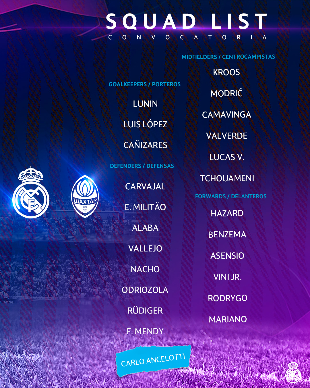 وجاءت قائمة النادي الملكي لمباراة شاختار على النحو التالي: