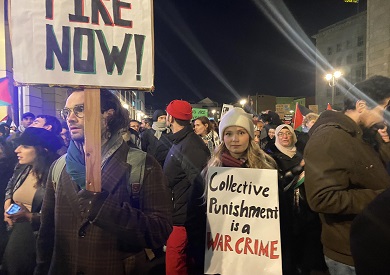 ورفع المتضامنون الإعلام الفلسطينية وارتد اغلبهم الكوفية الرمز الفلسطيني الشهير، وسط هتافات، "الحرية لفلسطين"، و"أوقفوا قتل المدنيين في غزة"، "أوقفوا الإبادة في غزة"، "الحرية لغزة.. احفظوا غزة الآن".